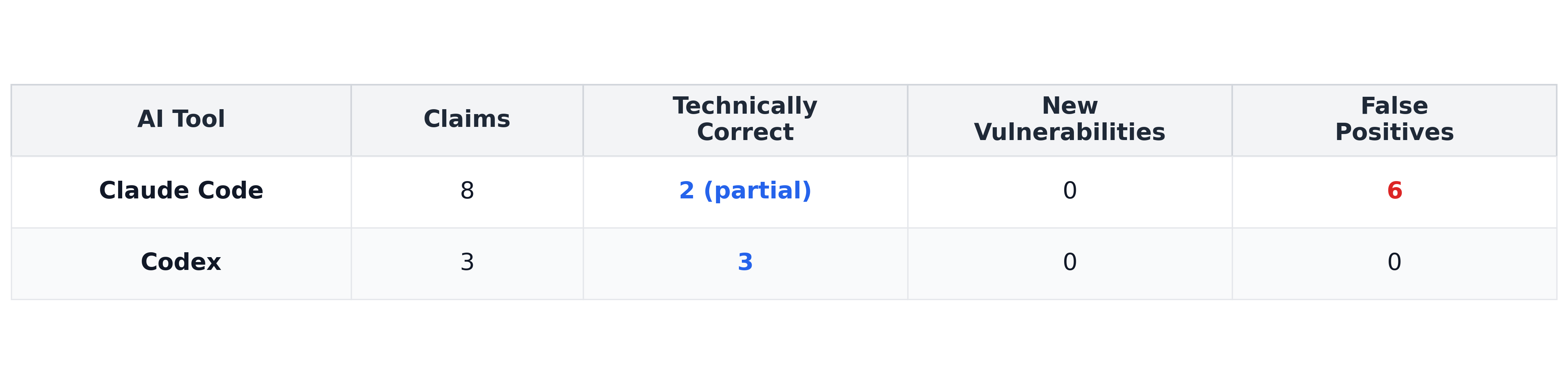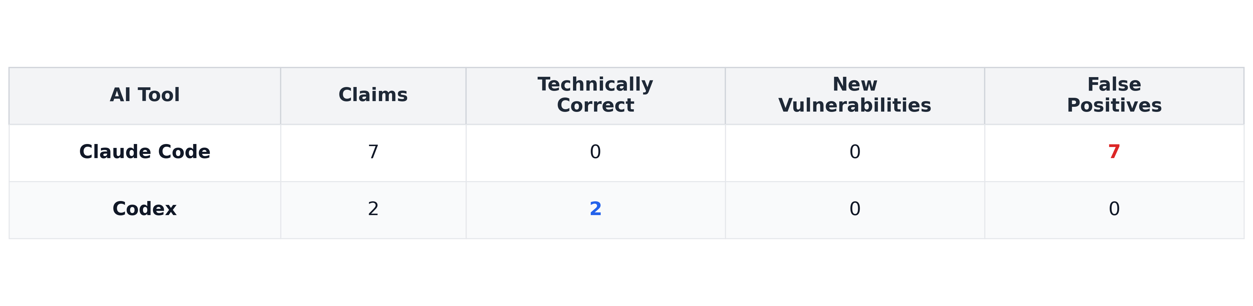 Across both codebases, the AI tools generated 20 vulnerability claims.