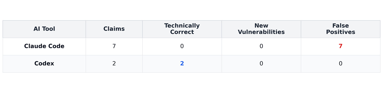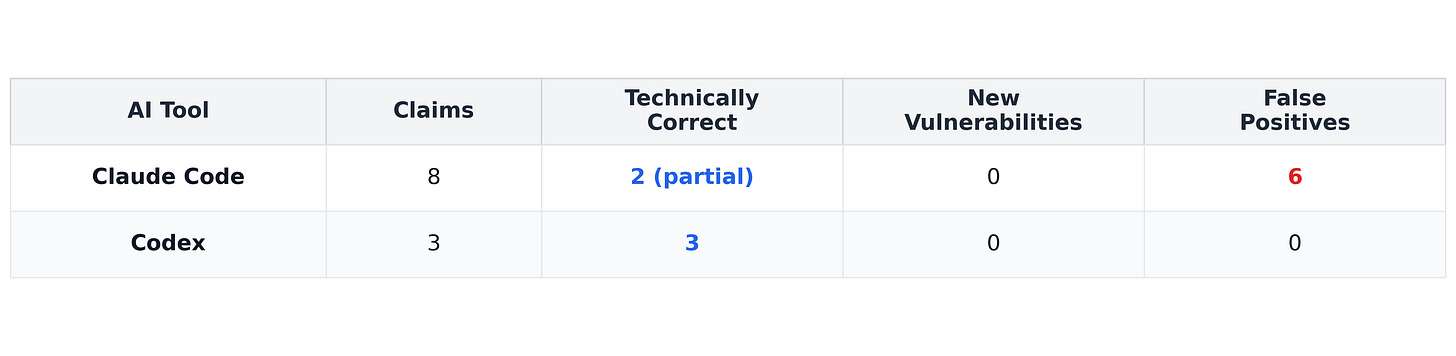Codex made five claims that exactly described how the code behaved but none were new discoveries (reflected known limitations or documented security considerations). Codex even included a disclaimer: “These are not necessarily newly discovered CVEs.”