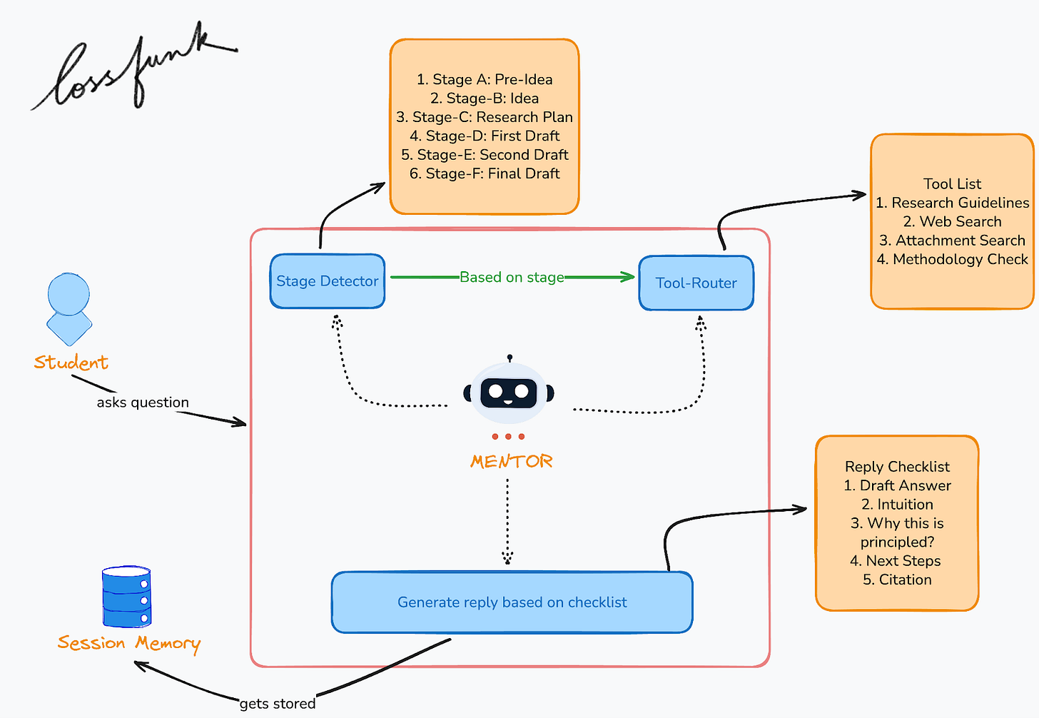 We wanted something more specific: an AI mentor that keeps track of where the student is in the research journey and nudges them forward with the right tools and checks.