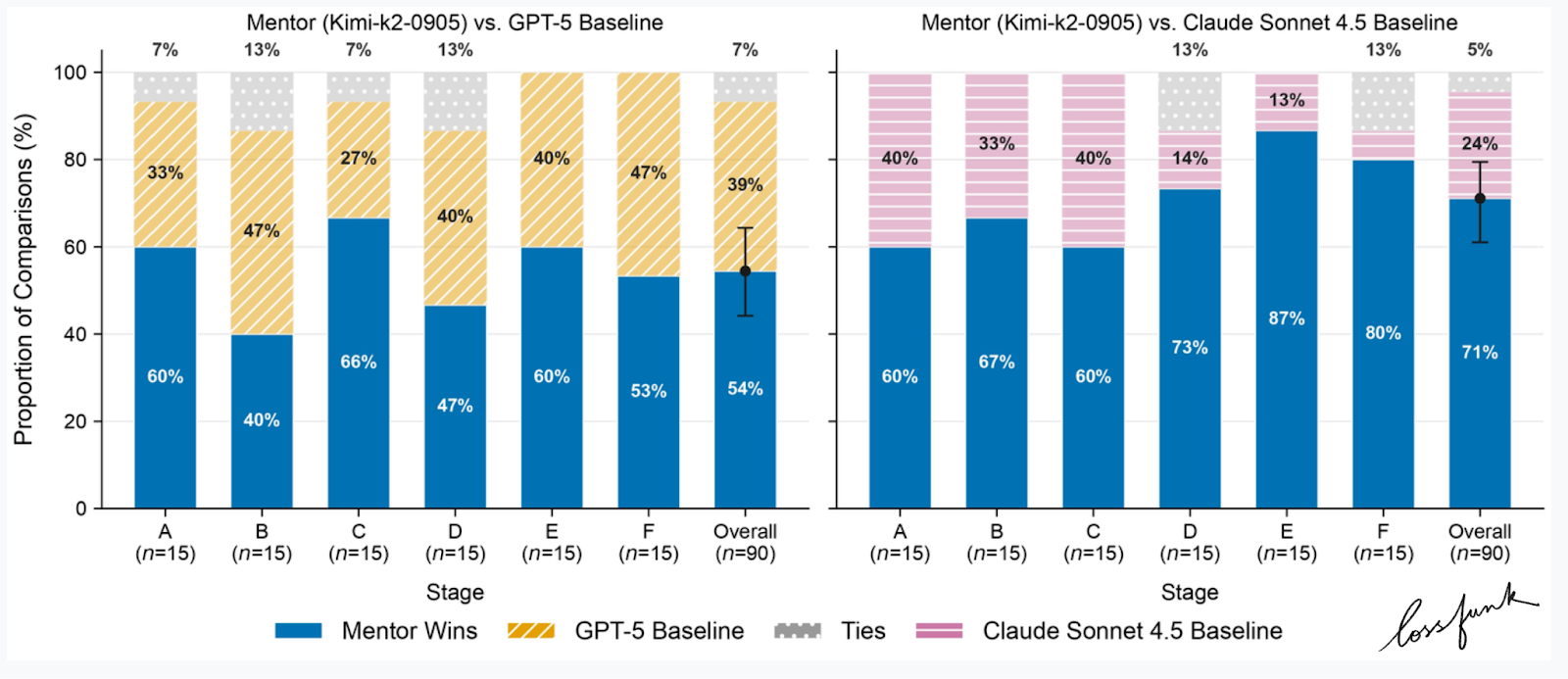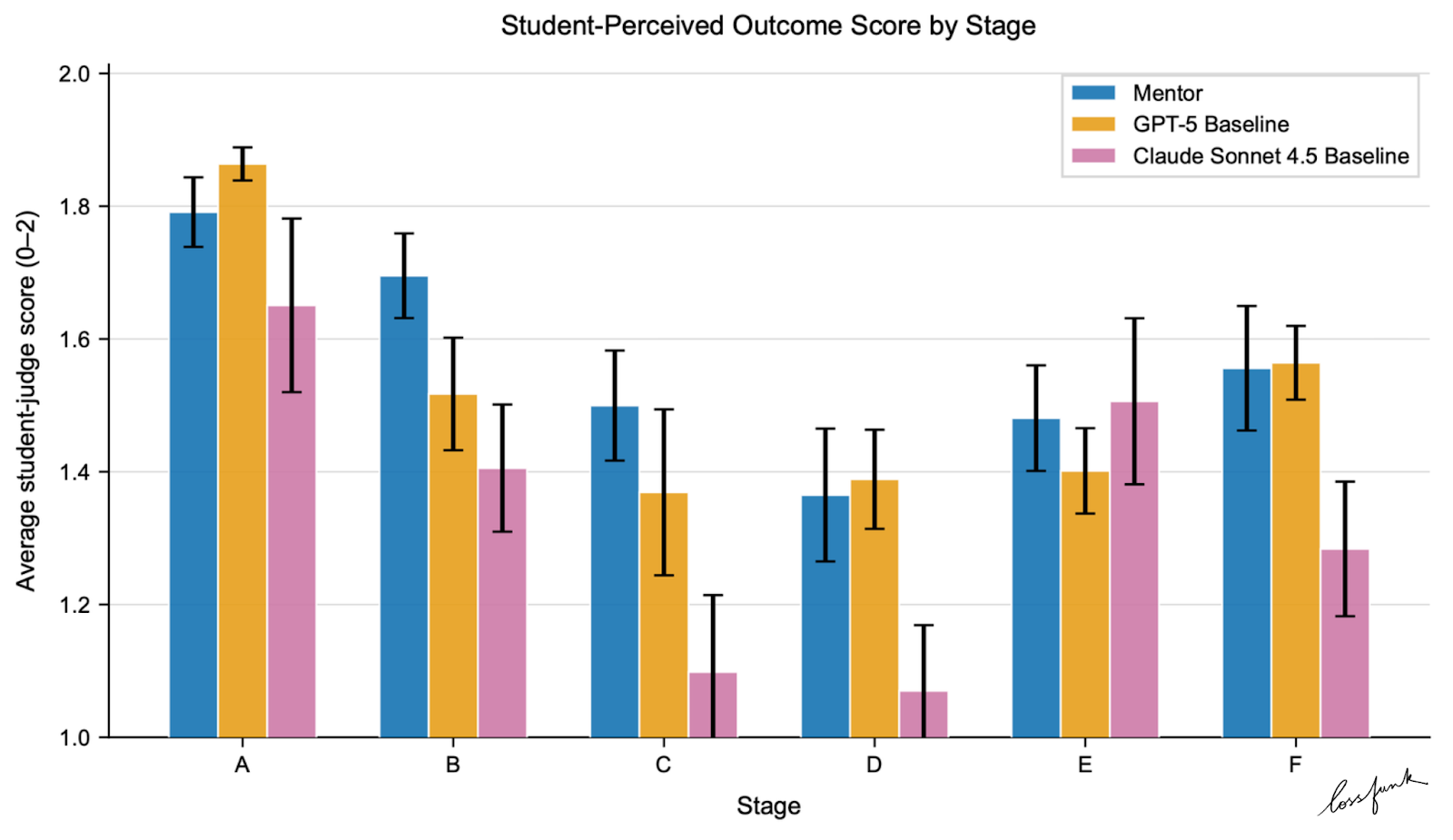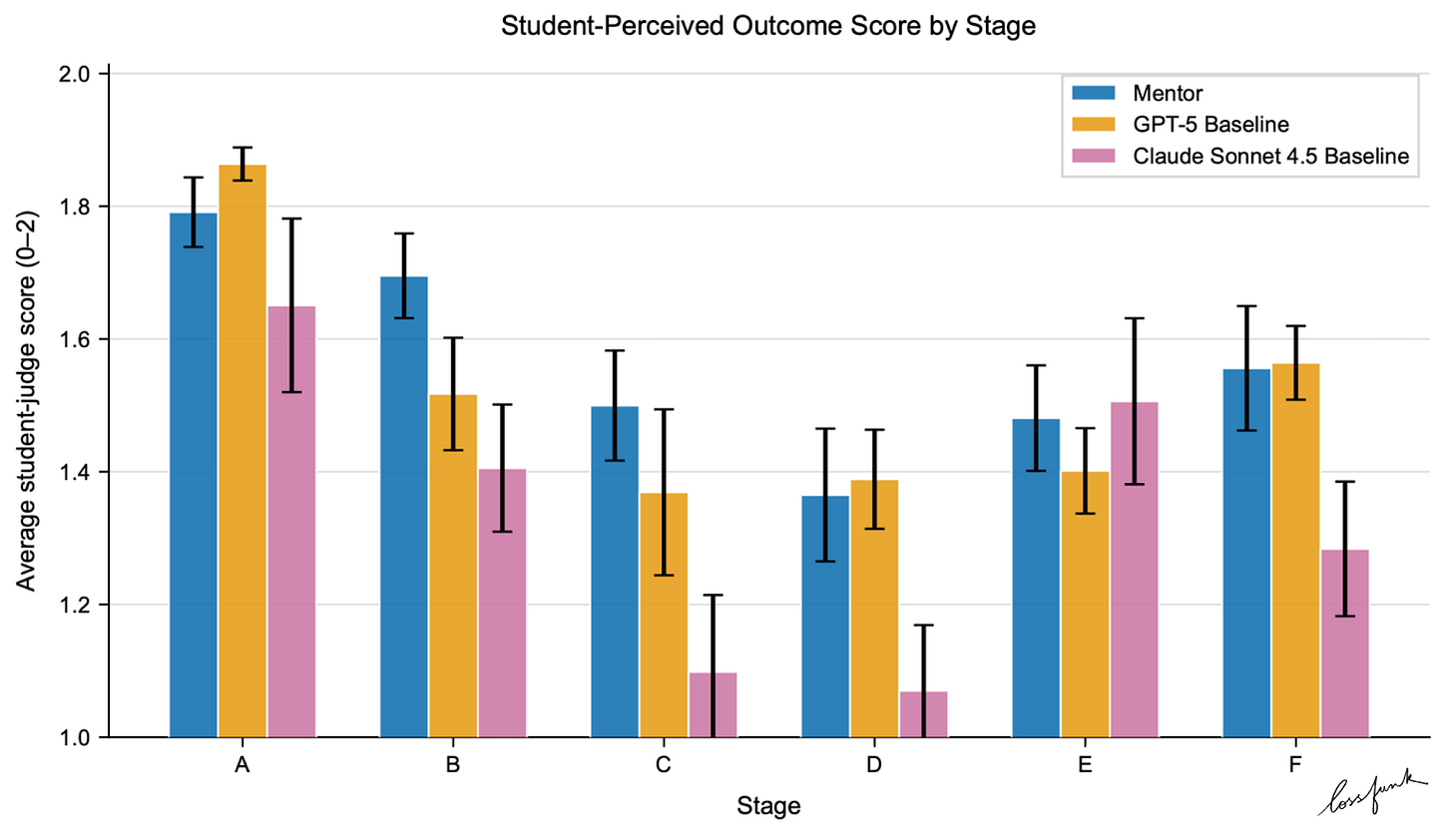 That structure seems to matter most when students are already working with a draft and need concrete, actionable feedback. We saw the clearest lift in stages D–F, where students have material on hand and the mentor can ground advice in actual text, not just general tips.
