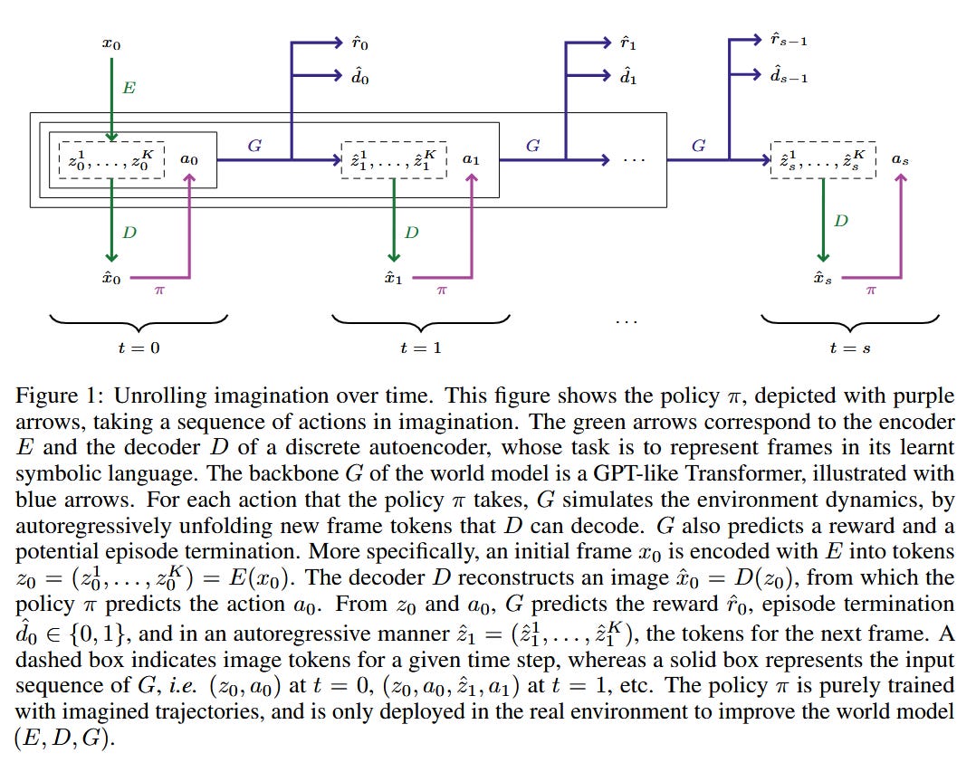 The IRIS paper demonstrated that Transformers can serve as highly sample-efficient world models for complex visual environments. Building on top of previous work IRIS introduced a novel architecture that replaces traditional recurrent networks with a discrete autoencoder paired with an autoregressive Transformer. The key innovation was in casting environment dynamics as a sequence modeling problem, frames are tokenized into discrete symbols, and a Transformer autoregressively predicts future tokens, rewards, and episode terminations based on actions taken. What made this particularly impactful for the field is that it validated Transformers as viable alternatives to recurrent architectures for world modeling, opening new pathways for more massively parallel architectures.