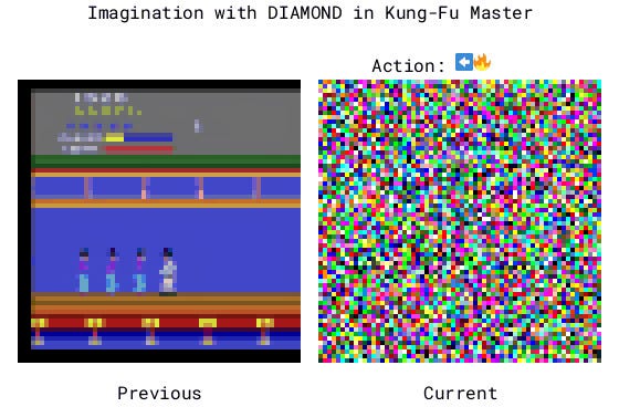 DIAMOND (DIffusion As a Model Of eNvironment Dreams) introduced the first successful application of diffusion models to world modelling for RL and achieved SOTA performance then in the Atari 100k benchmark. The key innovation they did was to adapt an EDM (Elucidating the Design Space of Diffusion Models) diffusion framework instead of traditional DDPM to generate stable, high-fidelity video predictions directly in pixel space with just 3 denoising steps which challenged the prevailing idea of direct latent state representations that were used by IRIS and Dreamerv3. Beyond benchmarks, the authors scaled their approach to model complex 3D environments like CS:GO , creating an interactive neural game engine that laid the framework for future work for world models to generate interactive environments.