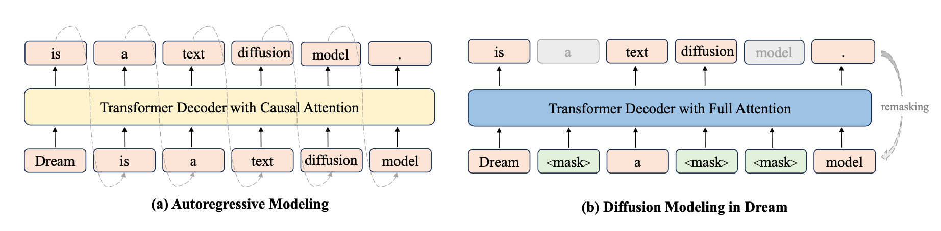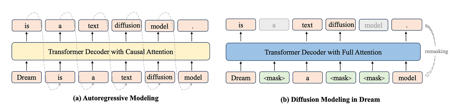 Dream is a diffusion model that predicts masked tokens, but its internal wiring is reused from the original AR model so it doesn’t lose its left-to-right knowledge.
