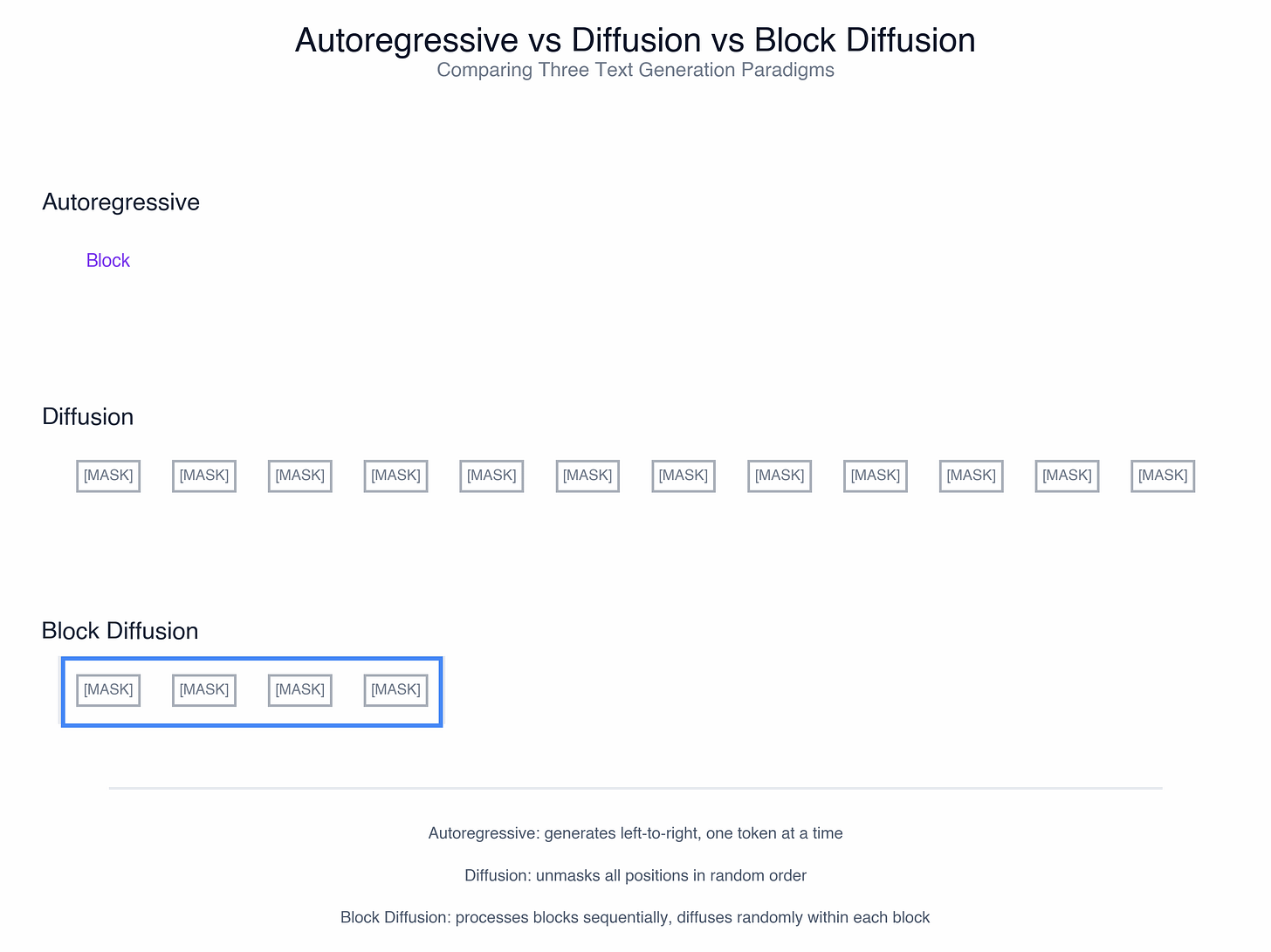 Parallelism: Inside a block, you denoise all B tokens in parallel. You get diffusion’s refinement power locally.