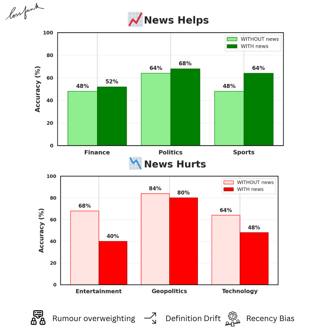 The recency bias example with the S&P 500 really resonates here - it perfectly ilustrates why blindly adding context can actully hurt reasoning. That overconfident YES when the model should've stuck with mean reversion logic is such a powerful failure mode to highlight. Makes me wonder if there's a way to weight historical context more competitively against fresh headlines?