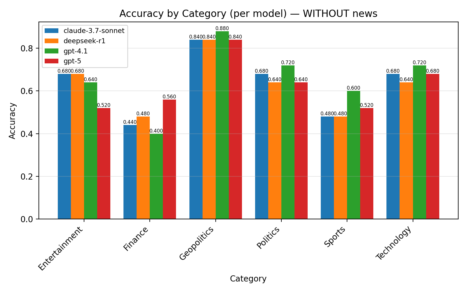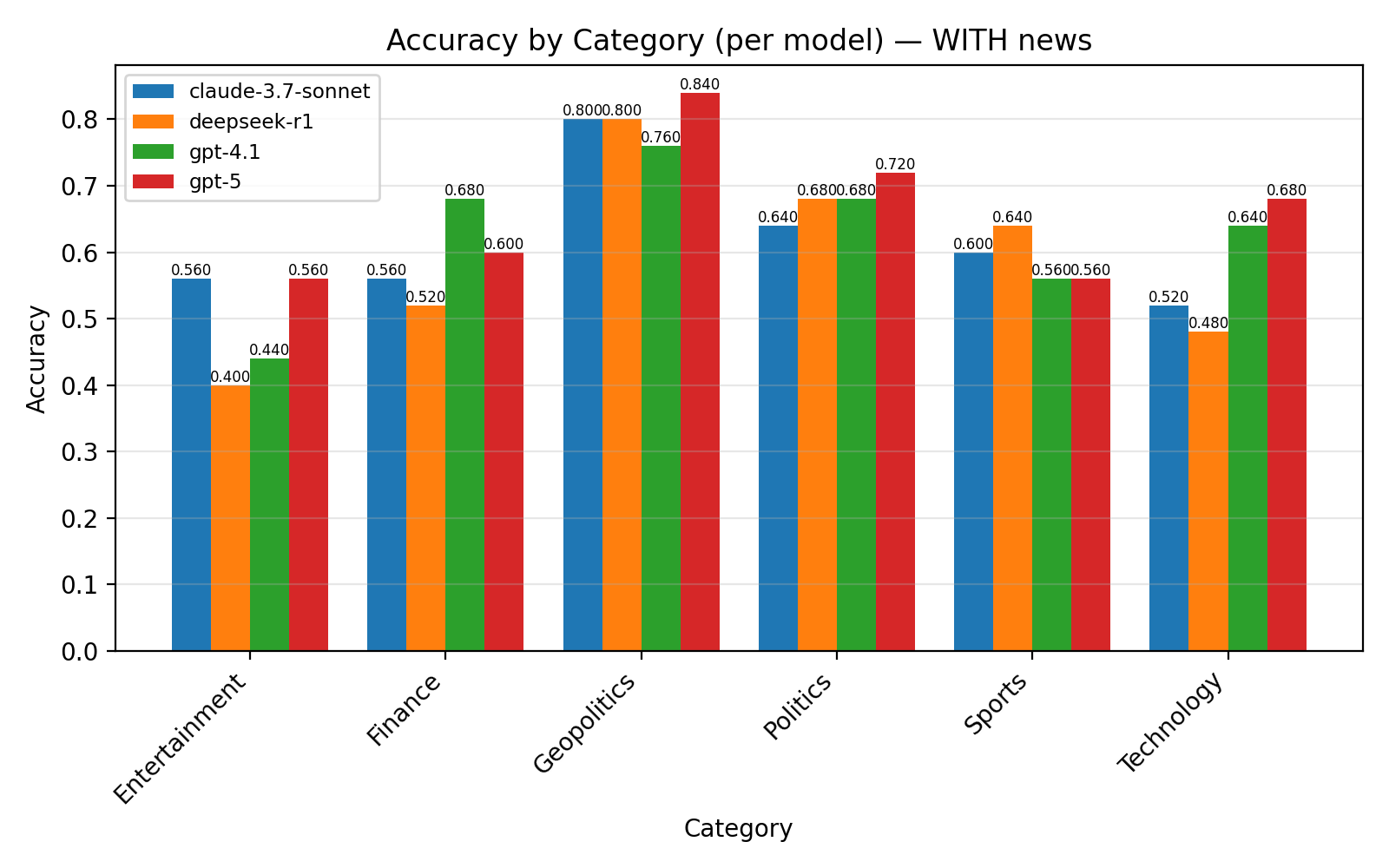 In general, adding news context sharpened forecasts and improve calibration for many models, offering a finer measure of reliability beyond raw accuracy. Some models showed strong calibration gains in domains such as Geopolitics and Politics, while others displayed higher ECE in noisier categories like Entertainment and Technology.