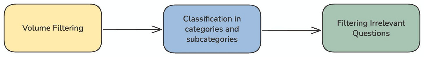 First, we applied volume filtering to remove low-liquidity markets, which typically corresponds to hyper-personalized or creator-specific questions. Next, we employed an LLM-as-a-Judge to classify each question into six primary categories, each with five sub-categories:
